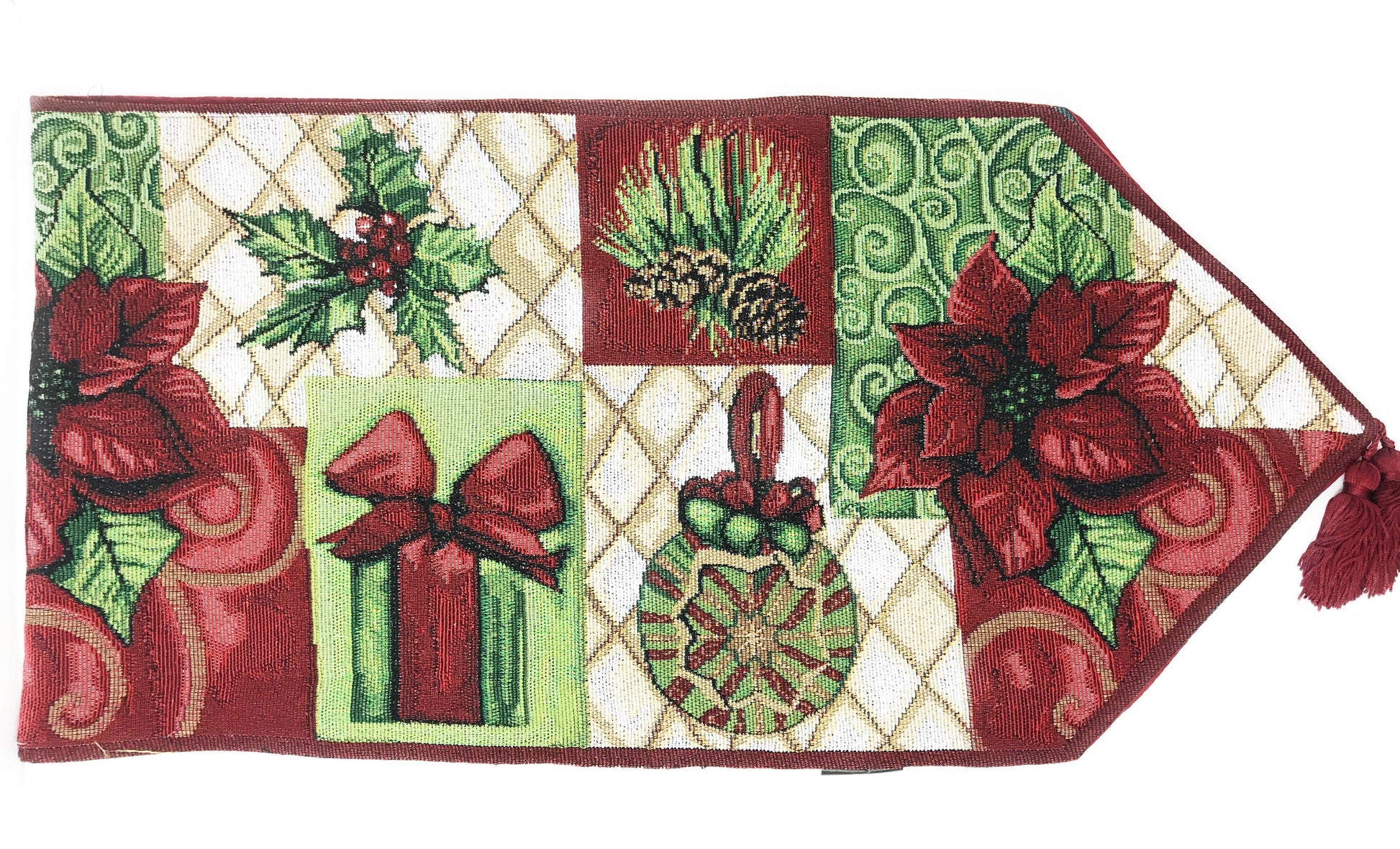 Ring in the holidays with this Festive Table Runner featuring red?Poinsettia, green ornaments and pine cone / conifer?cone. Decorated with all the symbols of the Holiday Season this Christmas Holiday Themed Table Runner will bring together any Holiday Themed Home. The Holiday Season may blown on by but this sturdy Table Runner will last for years to come.