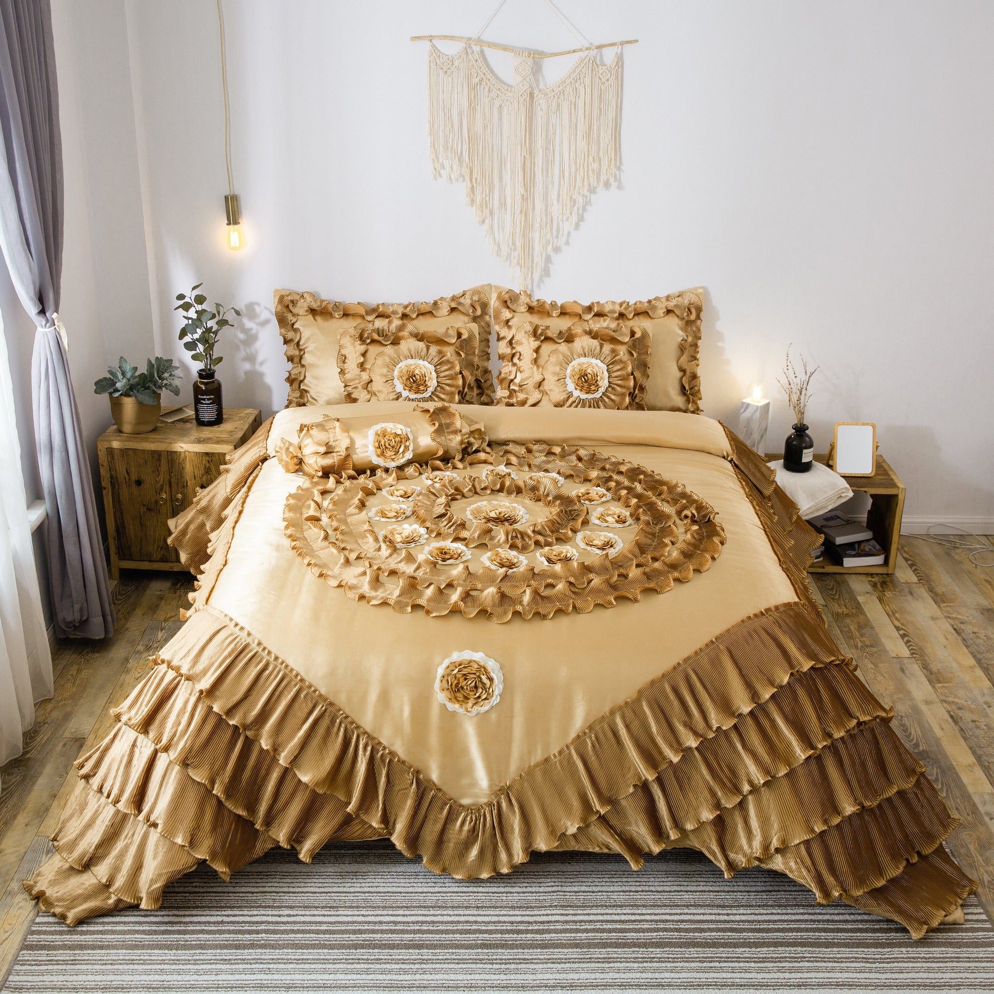 This comforter can dress up any classy room?with its gold design, satin faux silk material, and large floral ruffle embellishments.