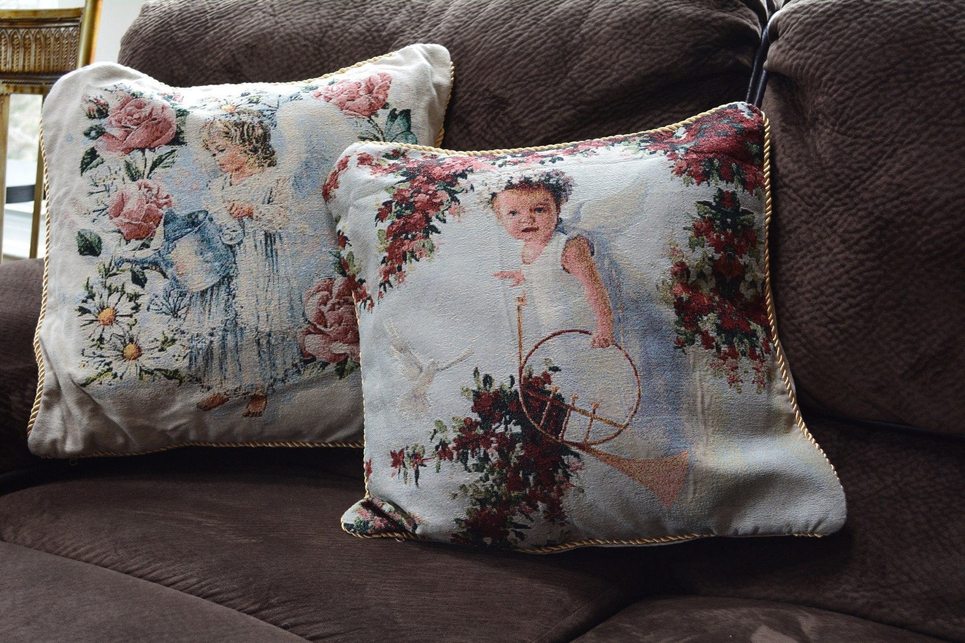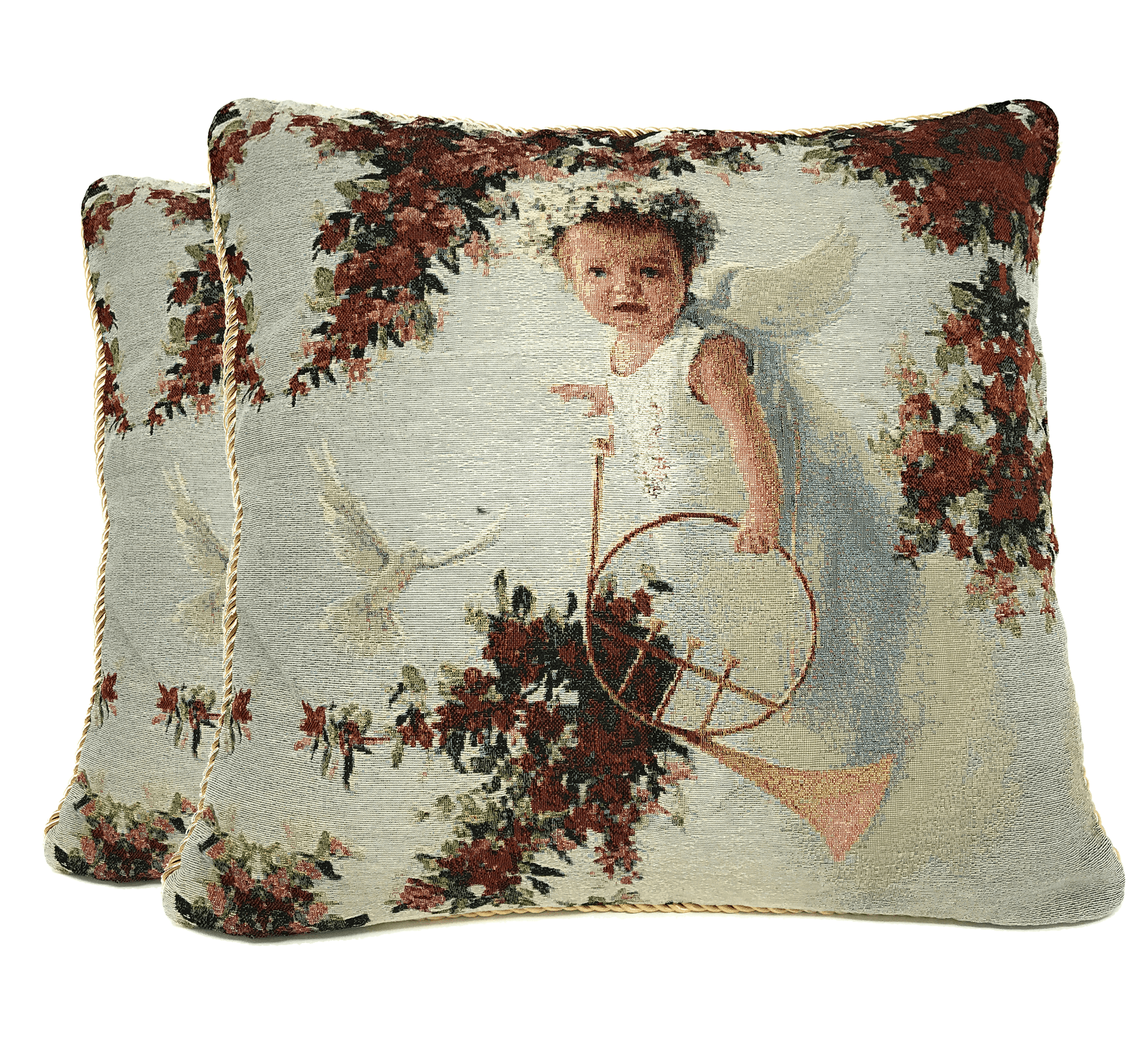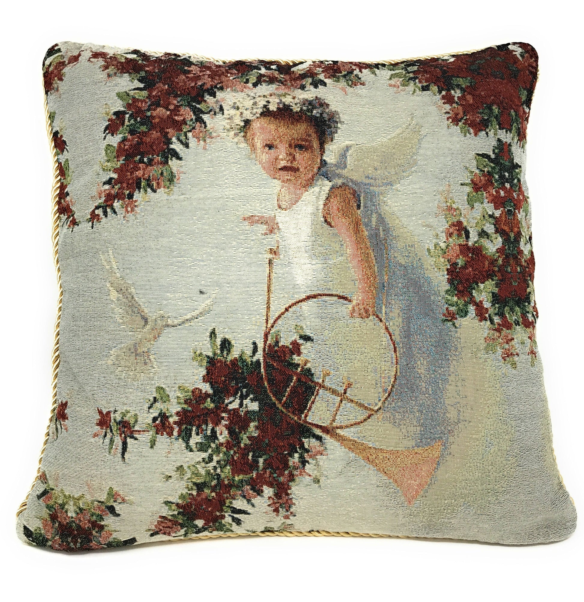 Enjoy Cupid's presence year-round with this cushion cover. The front of the?pillowcase?is a strong, firm upholstery fabric featuring a little girl. The back of the pillow is a soft tan fabric. The whole case is edged in a gold cord which gives it a feeling of elegance