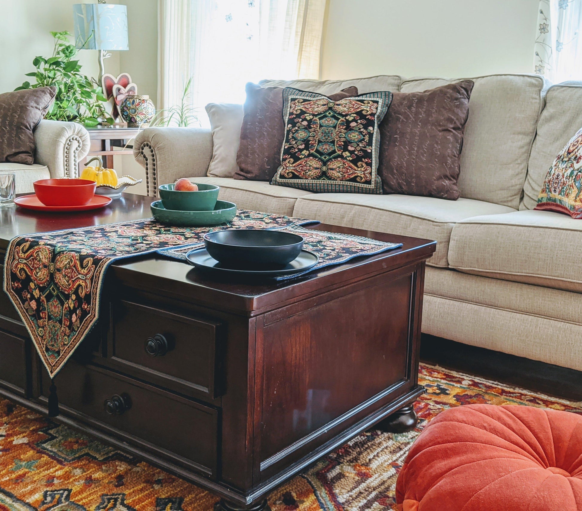 This table runner features a lovely black,green, and multi-colorful medallion design that is woven into the fabric.