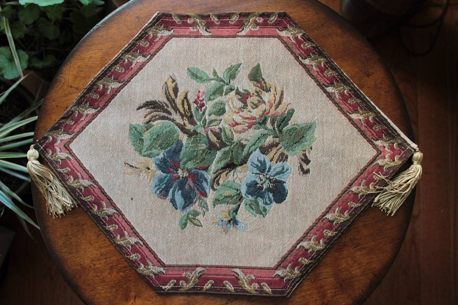 Get ready for the holiday by prepping your tables. This Festive and Vibrant Table Runner has lovely red flowers unfurling onto the scene and the festive color combination will make this a great addition to your holiday home