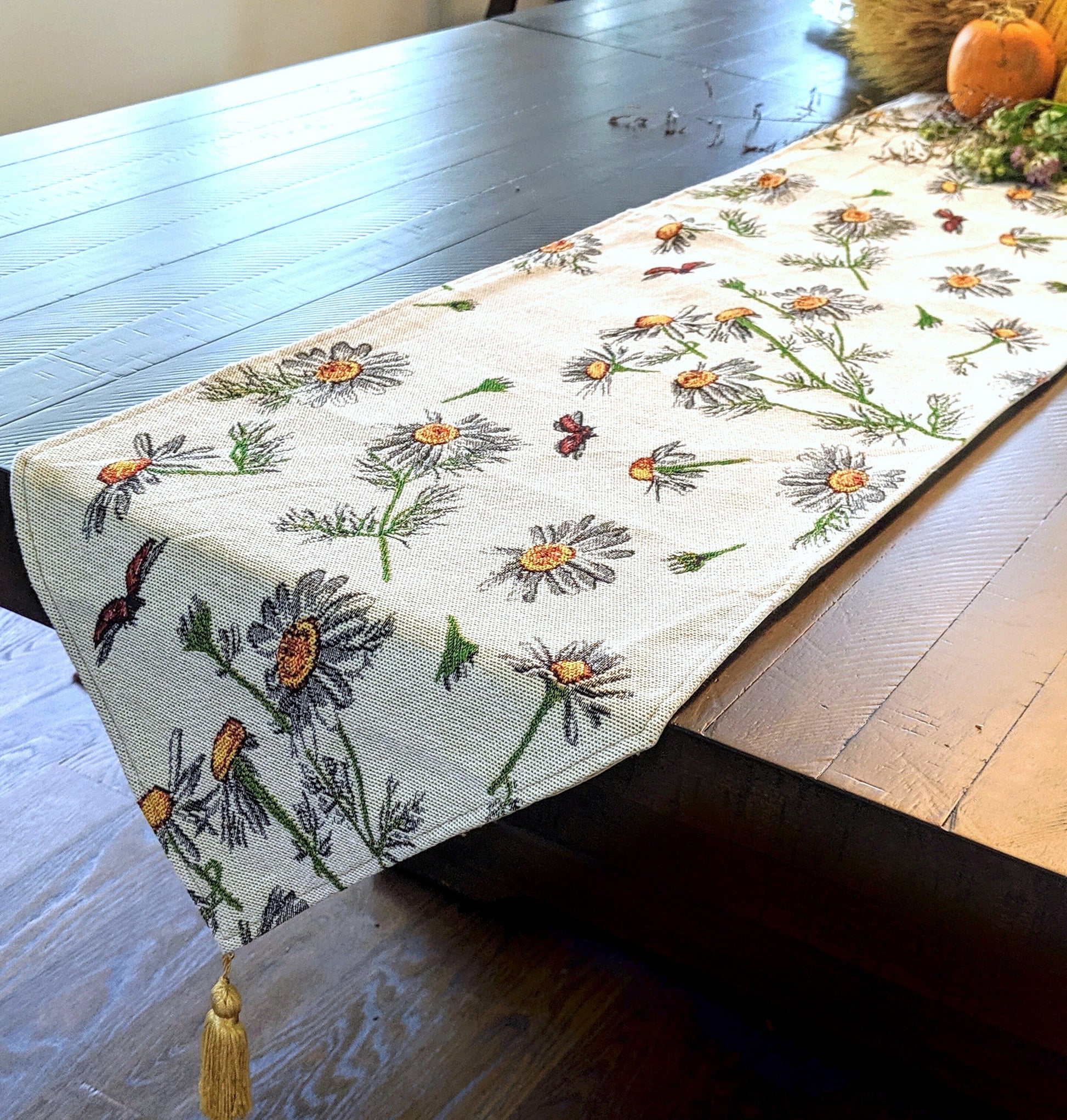 This?table runner linen?features small grey and yellow daisies with a couple of ladybugs flying past them.