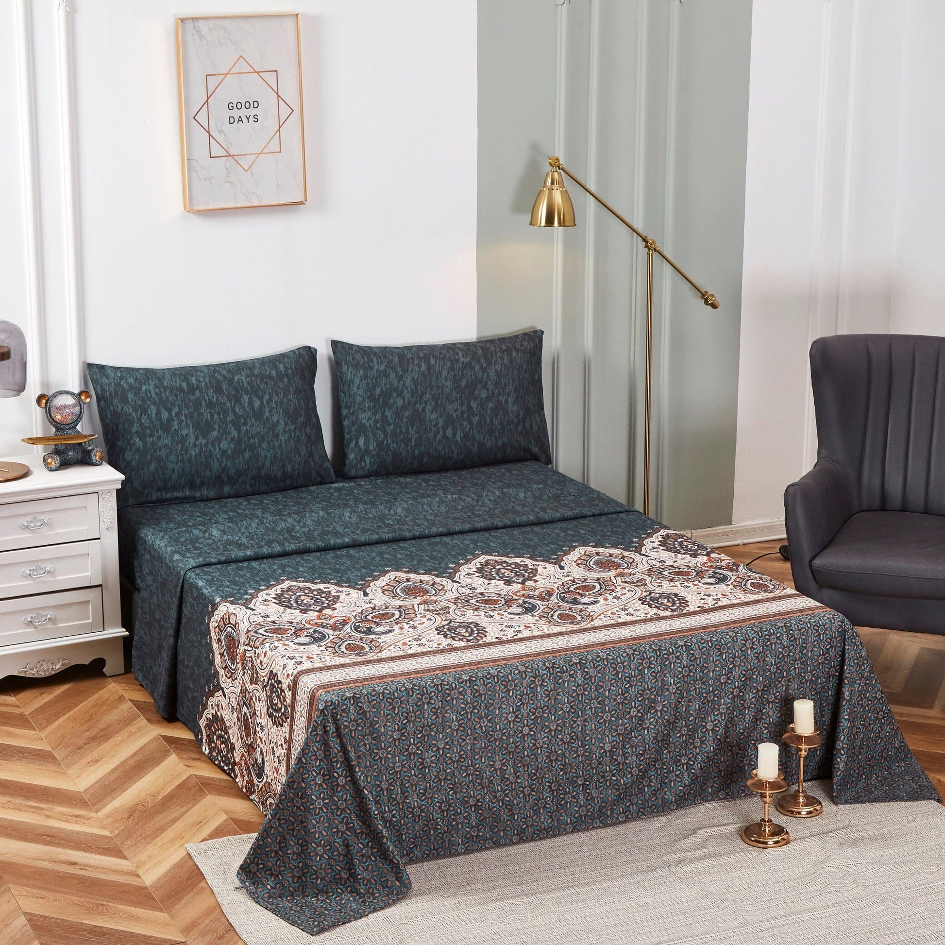 Tache Rustic Paisley Mandala Palace Floral Watercolor Dark Teal Fitted Sheet / Flat Sheet (KF174)