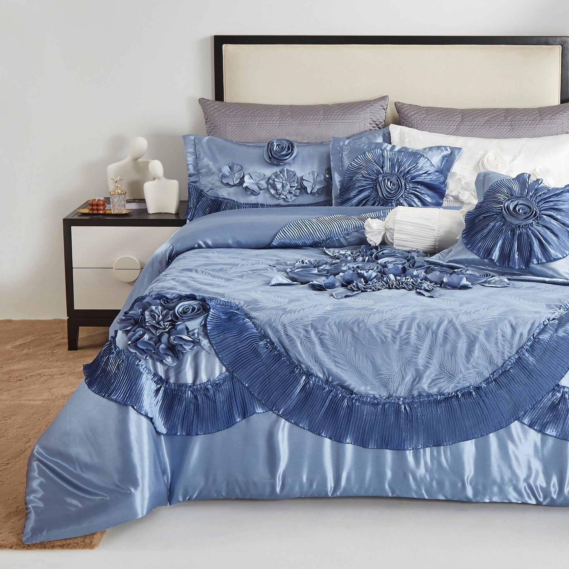 Make your bed fit for royalty with pleated ruffles, floral embellishments, and a beautifully detailed floral lace overlay.